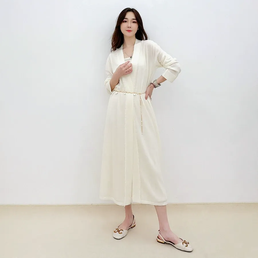 spring and autumn new 16 stitches fine spun mulberry silk knitted lazy and elegant long thin cardigan women loose outer outfit